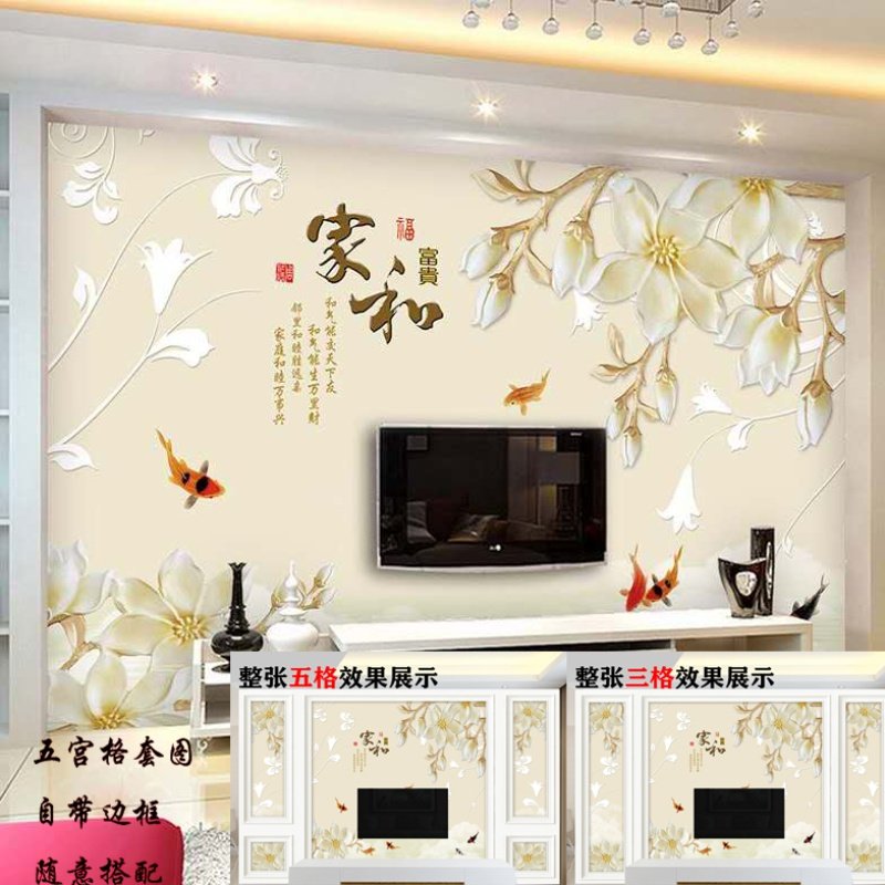9D新中式电视背景墙壁纸客厅自带墙纸影视墙布五宫格边框装饰。热门设计联盟服务商