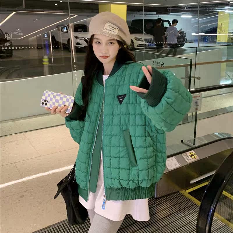 2021冬季新款韩版宽松显瘦压格纹图标拉链短款小个子棉服女外套潮热门设计联盟服务商