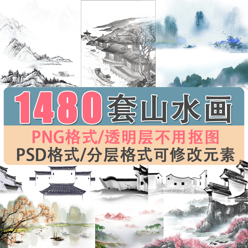 中国风山水墨画背景中式古典PNG免抠PS网页设计素材AI海报PSD分层热门设计联盟服务商